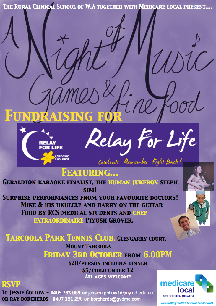 The Rural Clinical School of WA and Goldfields Midwest Medicare Local present A Night of Music, Games and Fine Food to raise money for Relay for Life.