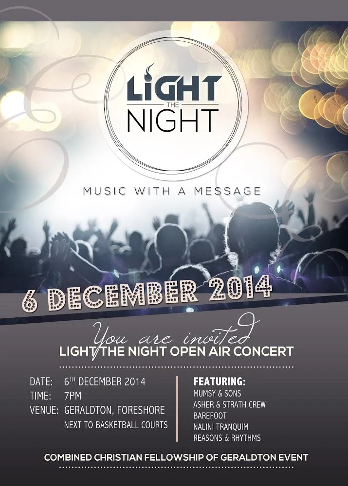 The Combined Christian Fellowship of Geraldton will host the Light the Night free open-air concert at 7:00pm on the Geraldton foreshore near the basketball courts on Saturday 6th of December. Music students from Strathalbyn Christian College will be performing with Music teacher Mr Graieg-Morrison. A number of other College staff will also play on the evening.