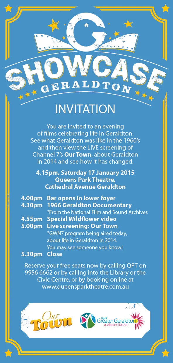 The Geraldton community is invited to ‘Showcase Geraldton’ on Saturday, January 17 at 4:15pm at the Queen’s Park Theatre, to enjoy a late afternoon of films celebrating life in Geraldton.