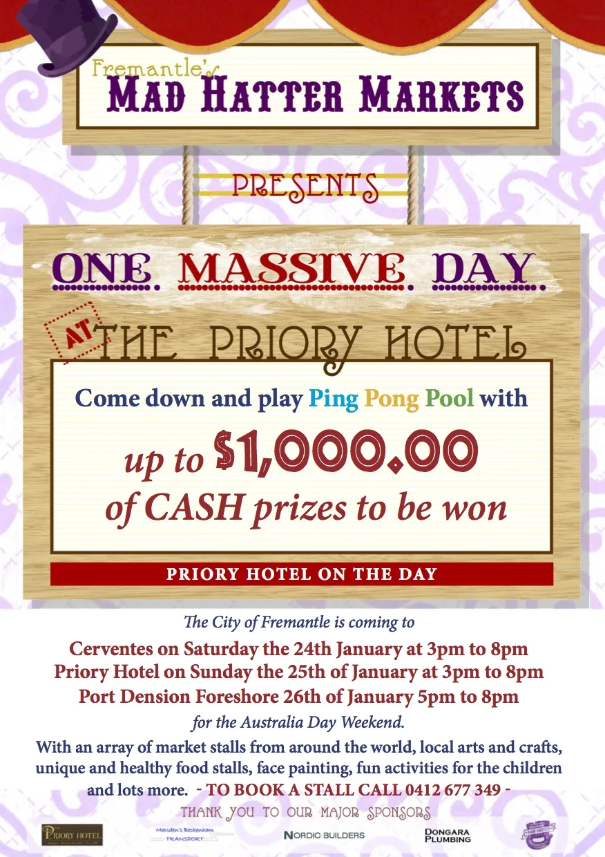 Mad Hatter Markets Fremantle will be at the priory hotel this Sunday. Great fun for the whole family live music, Markets stalls from around the world Ping Pong Pool and Lots more.
