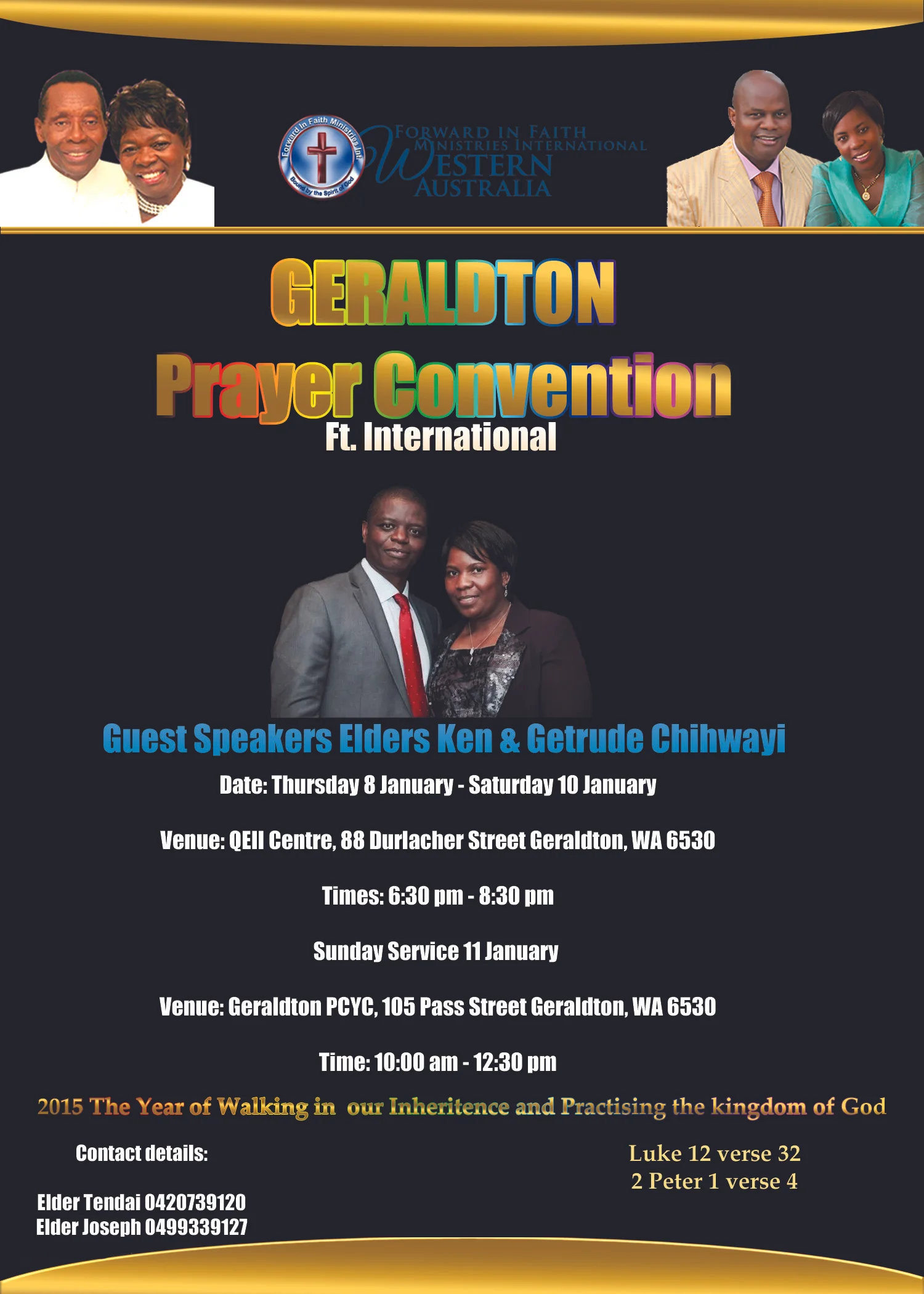 FORWARD IN FAITH MINISTRIES WITH BE HOLDING A PRAYER CONVENTION FOR THE CITY OF GERALDTON FROM THE 8TH TO THE 11TH OF JANUARY FEATURING INTERNATIONAL SPEAKERS - ELDERS KEN & GERTRUDE CHIHWAYI. ALL ARE WELCOME.