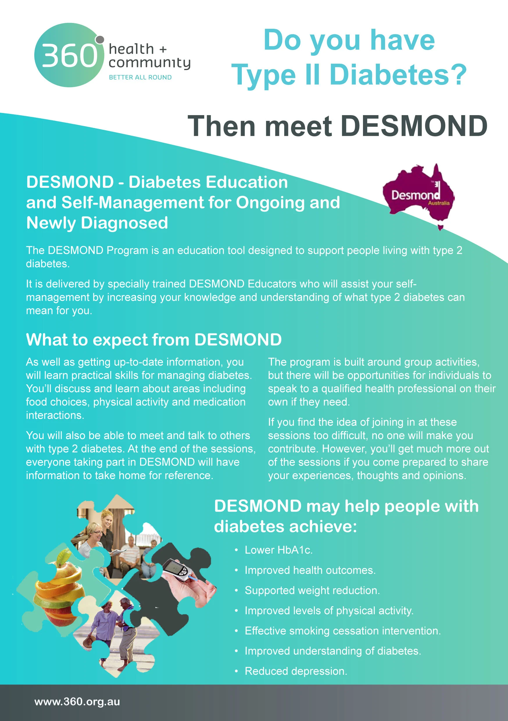 DESMOND is quite unique as it is an education program designed to support you, the person with diabetes, to become the expert. DESMOND will empower you to take control and make decisions relating to your diabetes.