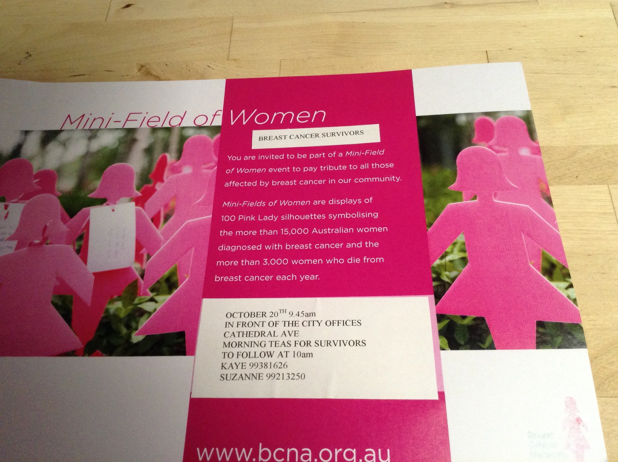 Breast Cancer Network Australia representatives, Kaye Street and Suzanne Hogue will host a Mini field of Women by installing pink silhouettes in the lawn in front of the City Offices in cathedral avenue. We will do this on Tuesday 20th October at 9.30-9.45, afterwards ladies who have had a diagnosis of Breast Cancer are invited to join us in the city offices for morning tea.