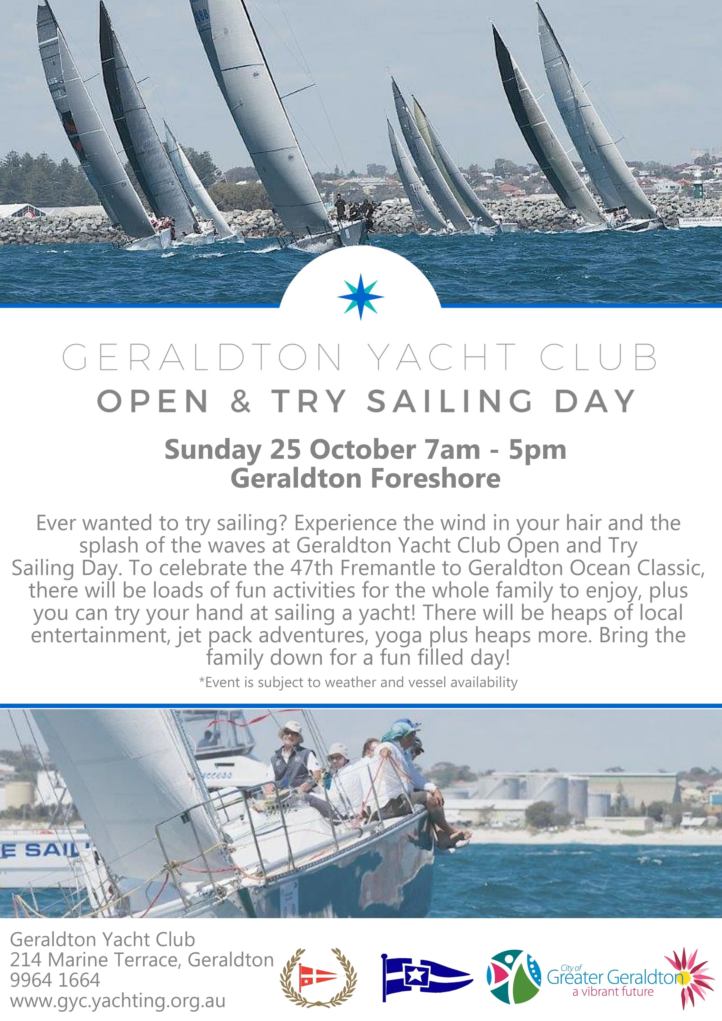 To celebrate the 47th Fremantle to Geraldton Ocean Classic the Foreshore will come alive for a day of fun as part of the Geraldton Yacht Club’s Open and Try Sailing Day.