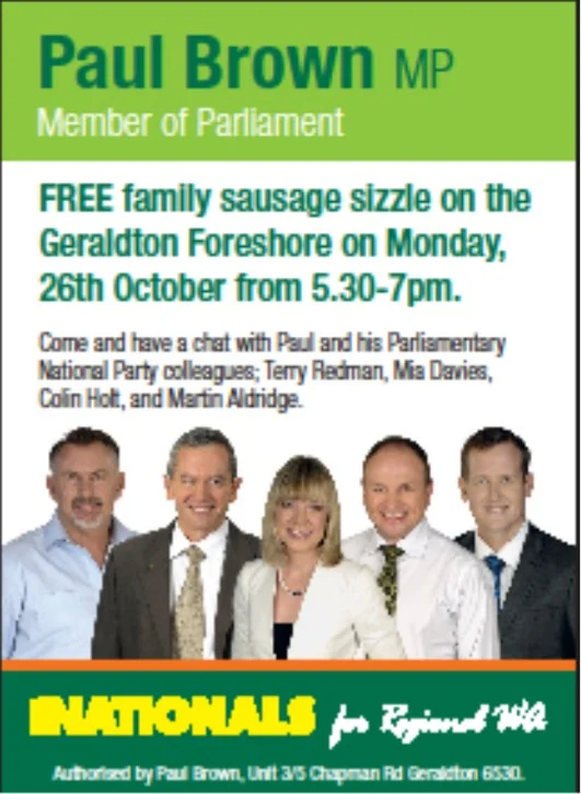 Free family sausage sizzle on the Geraldton Foreshore on Monday, 26th October 2015 5.30-7.00pm. Come and have a chat with Paul and his Parliamentary National Party Colleagues - Terry Redman, Mia Davies, Colin Holt and Martin Aldridge.