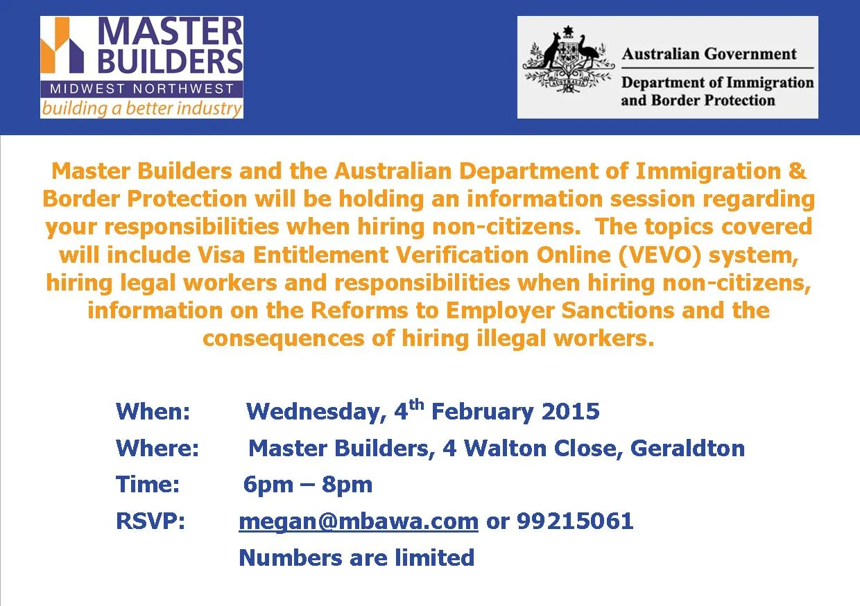Information session regarding your responsibilities when hiring non-citizens. The topics covered will include Visa Entitlement Verification Online (VEVO) system, hiring legal workers and responsibilities when hiring non-citizens, information on the Reforms to Employer Sanctions and the consequences of hiring illegal workers.