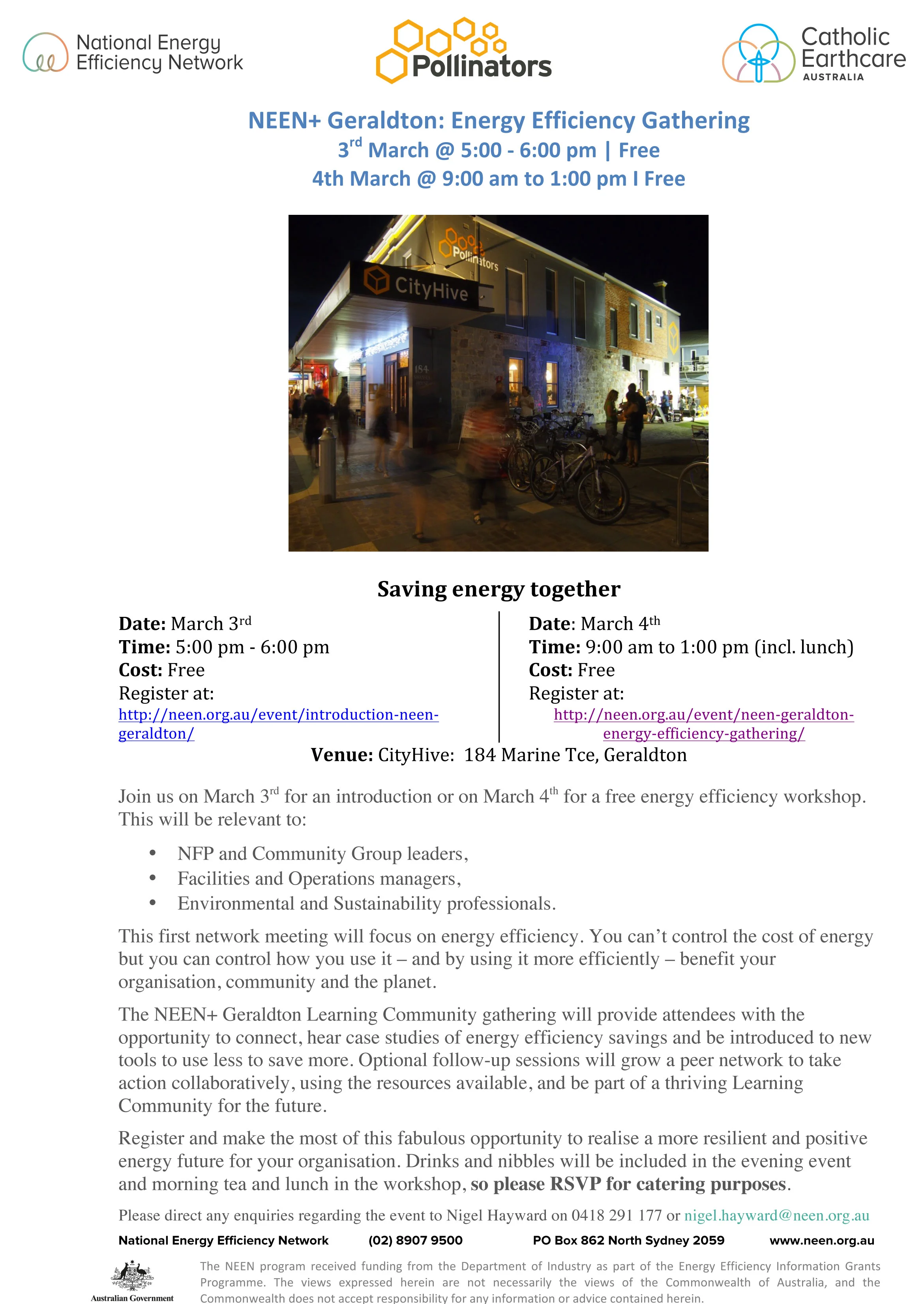 The National Energy Efficiency Network, with the support of Pollinators Inc – Geraldton, is offering faith-based and not-for-profit community organisations in the Geraldton region, a free program to help them become more energy efficient, resilient and sustainable into the future.