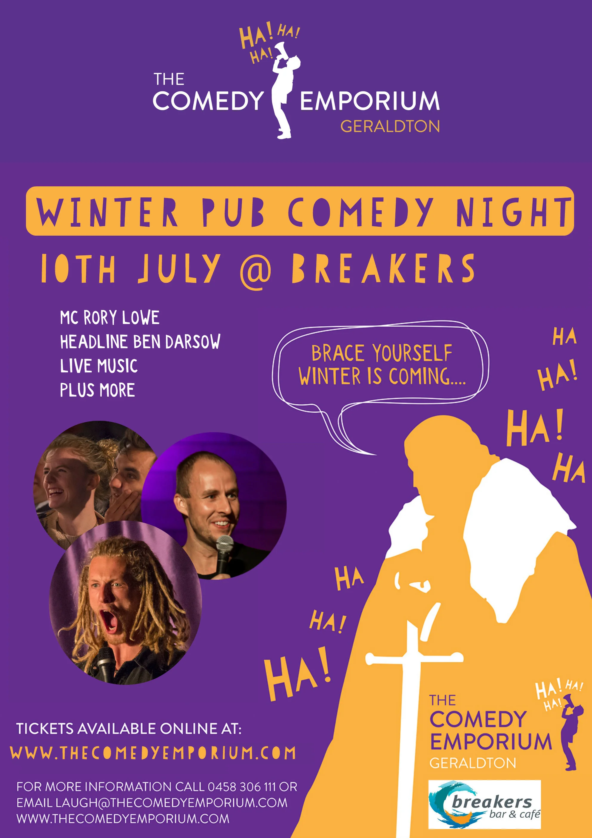 The Comedy Emporium's Winter Pub Comedy Night will help comedians break the ice for audiences and give them a huge night of laughs, live music and good times down at Breakers Bar on Friday July 10.
