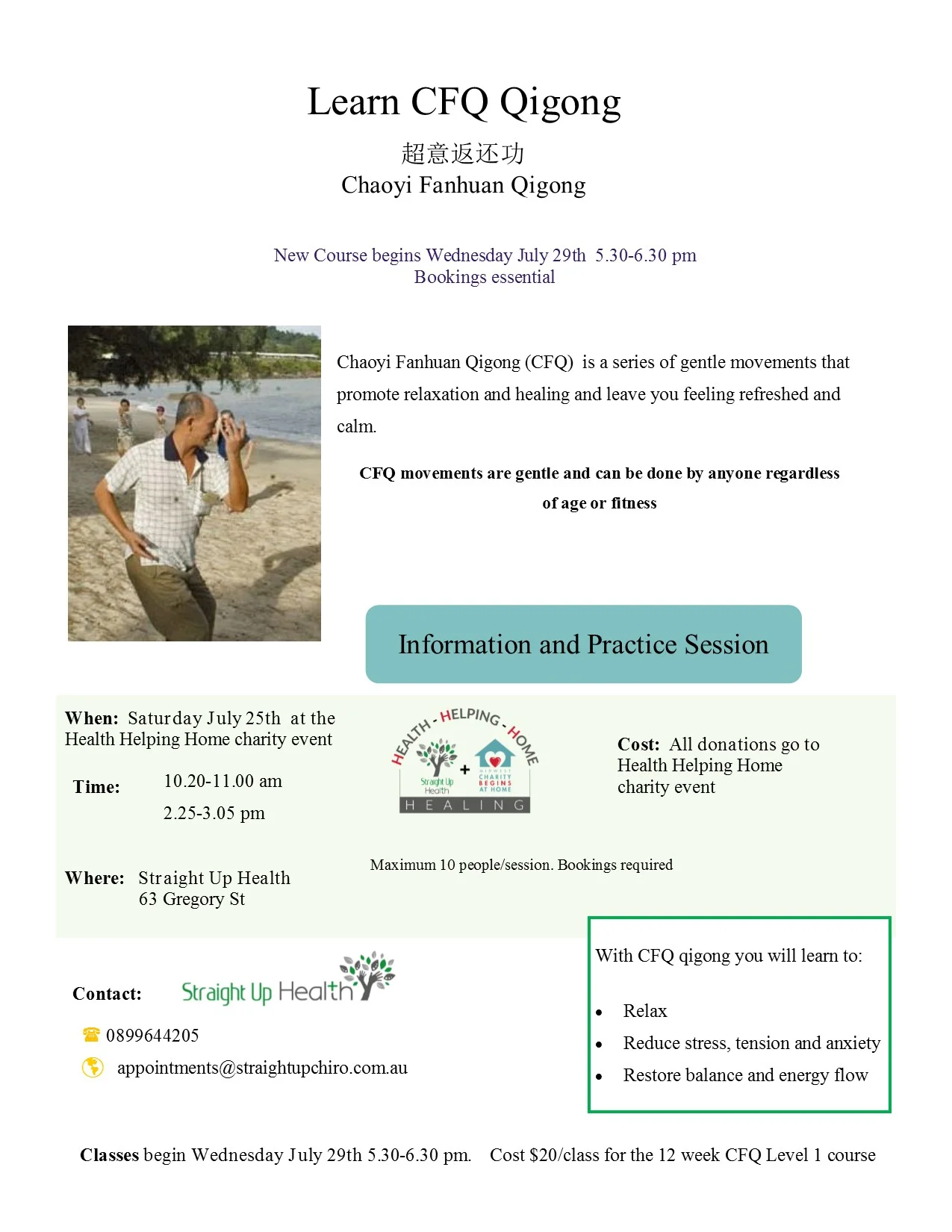Come along and learn what is CFQ Qigong and practise a couple of the gentle movements during the Health Helping Home fundraising event at Straight Up Health on Saturday July 25th. There will be two sessions during the day - 10.20-11.00 am and 2.25-3.05. The cost is a small donation on the day.