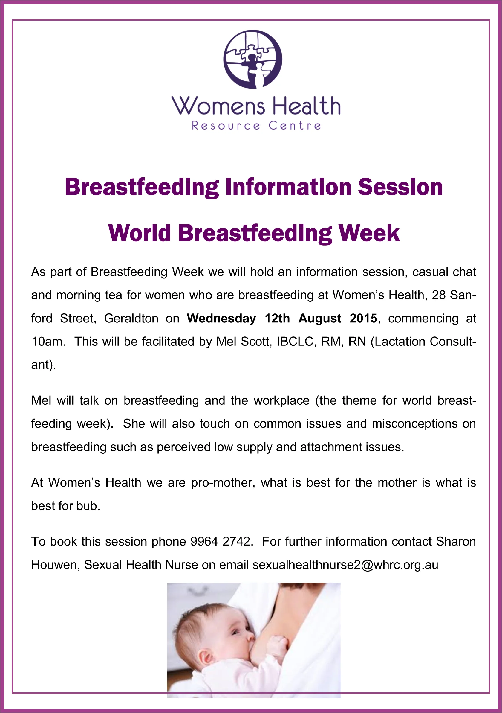 As part of Breastfeeding Week we will hold an information session and morning tea facilitated by Mel Scott (Lactation Consultant)