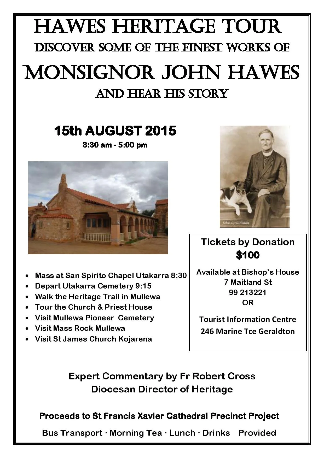 Mass and tour at Utakarra Chapel followed by a bus trip to Mullewa to explore the Hawes Heritage Walk, the Church, the Priesthouse, Mass Rock and the Pioneer Cemetery with a visit to St James Kojarena on the return journey. Expert commentary by Fr Cross, drinks, morning tea and lunch provided. Tickets now available at the Bishop’s House and the Visitor Information Centre.