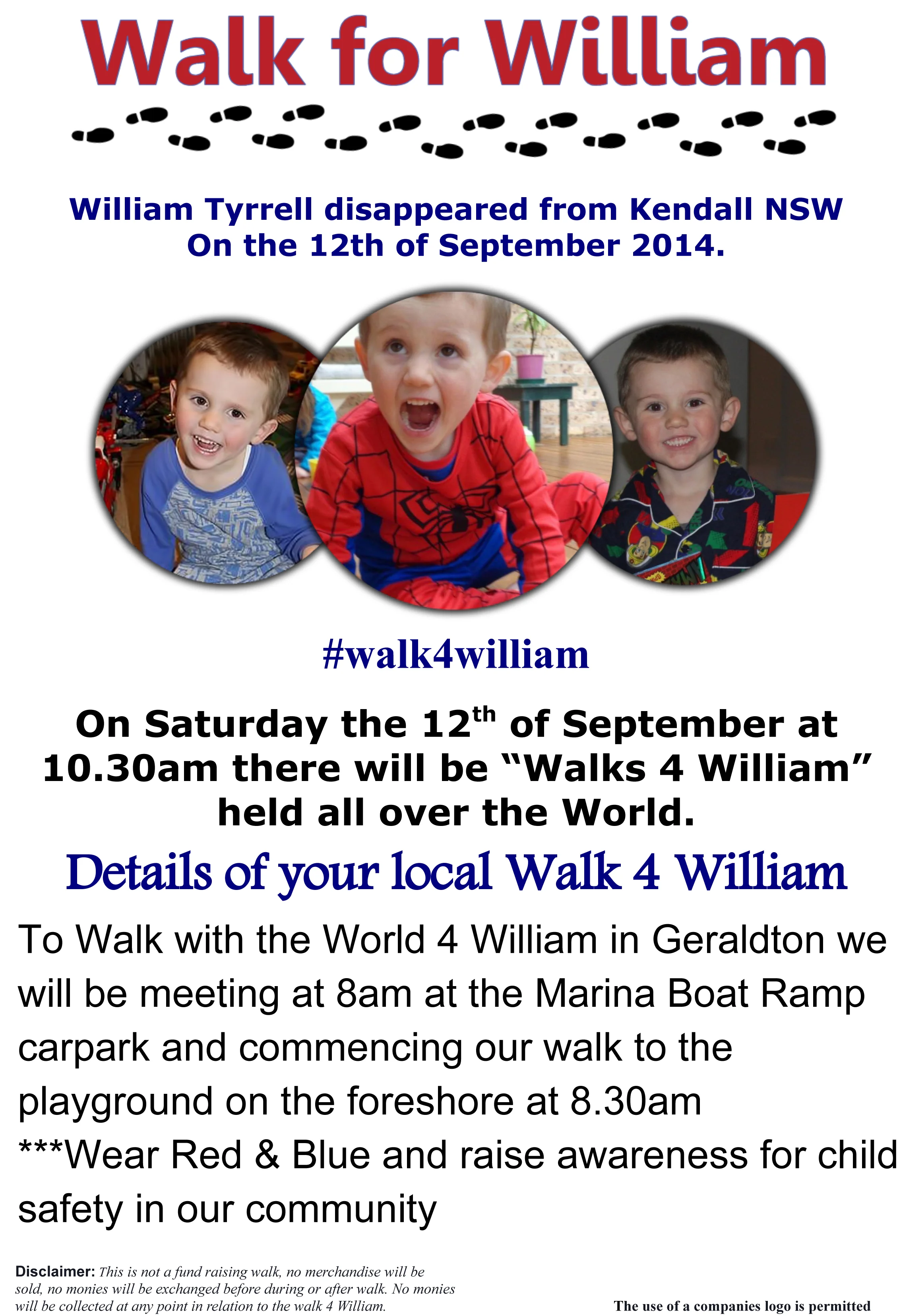 The National Walk 4 William Tyrell event promotes child safety and raises public awareness about missing children. #givehimback