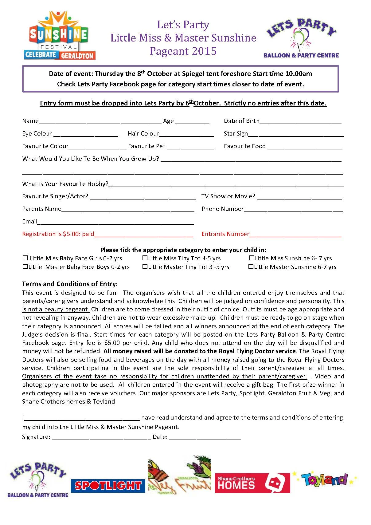 Get you entries in now for the Little Miss & Master Sunshine Pageant 2015 - Entries close on October 6th so act now!