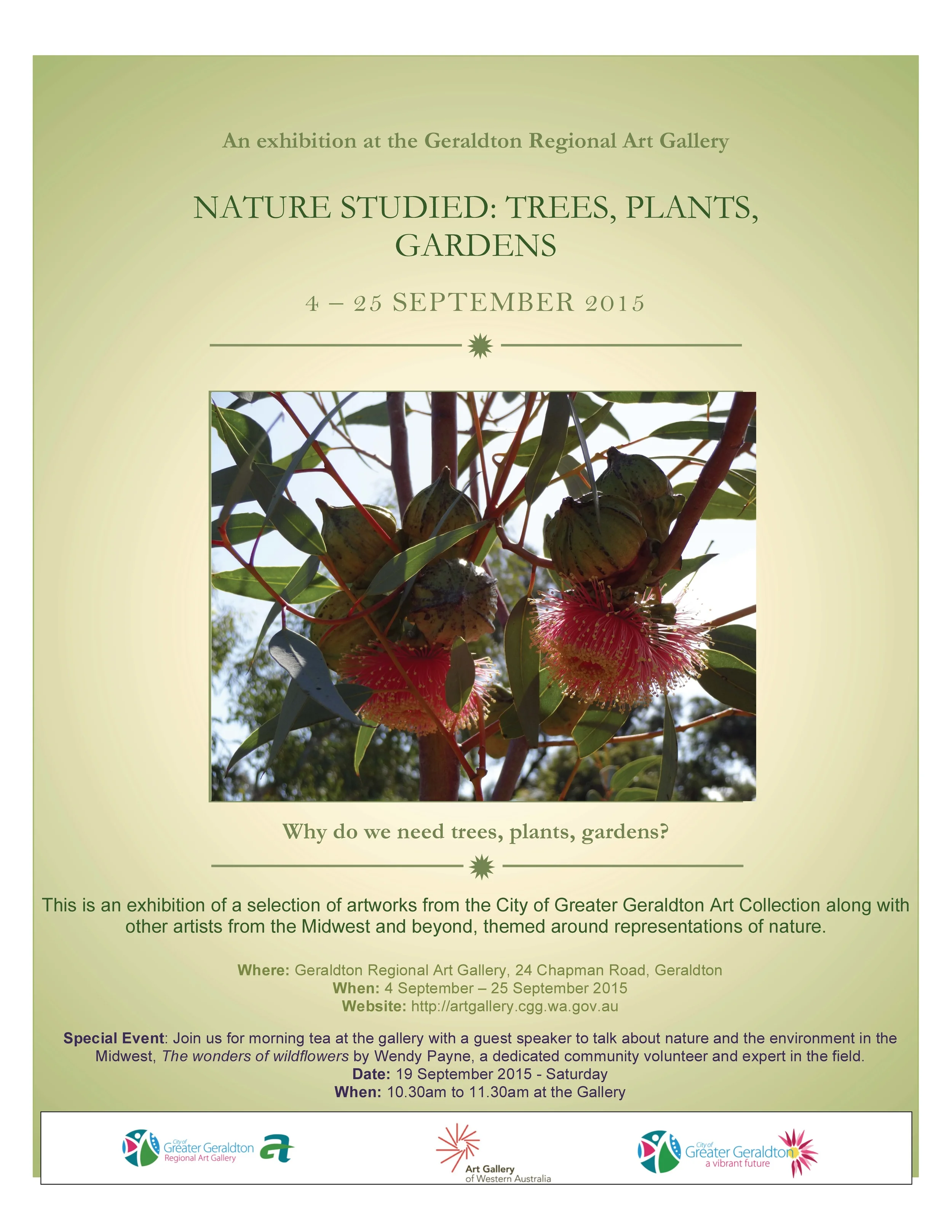 Special Event: Morning tea at the gallery with a guest speaker’s presentation on nature and the environment in the Midwest, The wonders of wildflowers by Wendy Payne, a dedicated community volunteer and expert in the field. Date: 19 September 2015 - Saturday When: 10.30am to 11.30am at the Gallery
