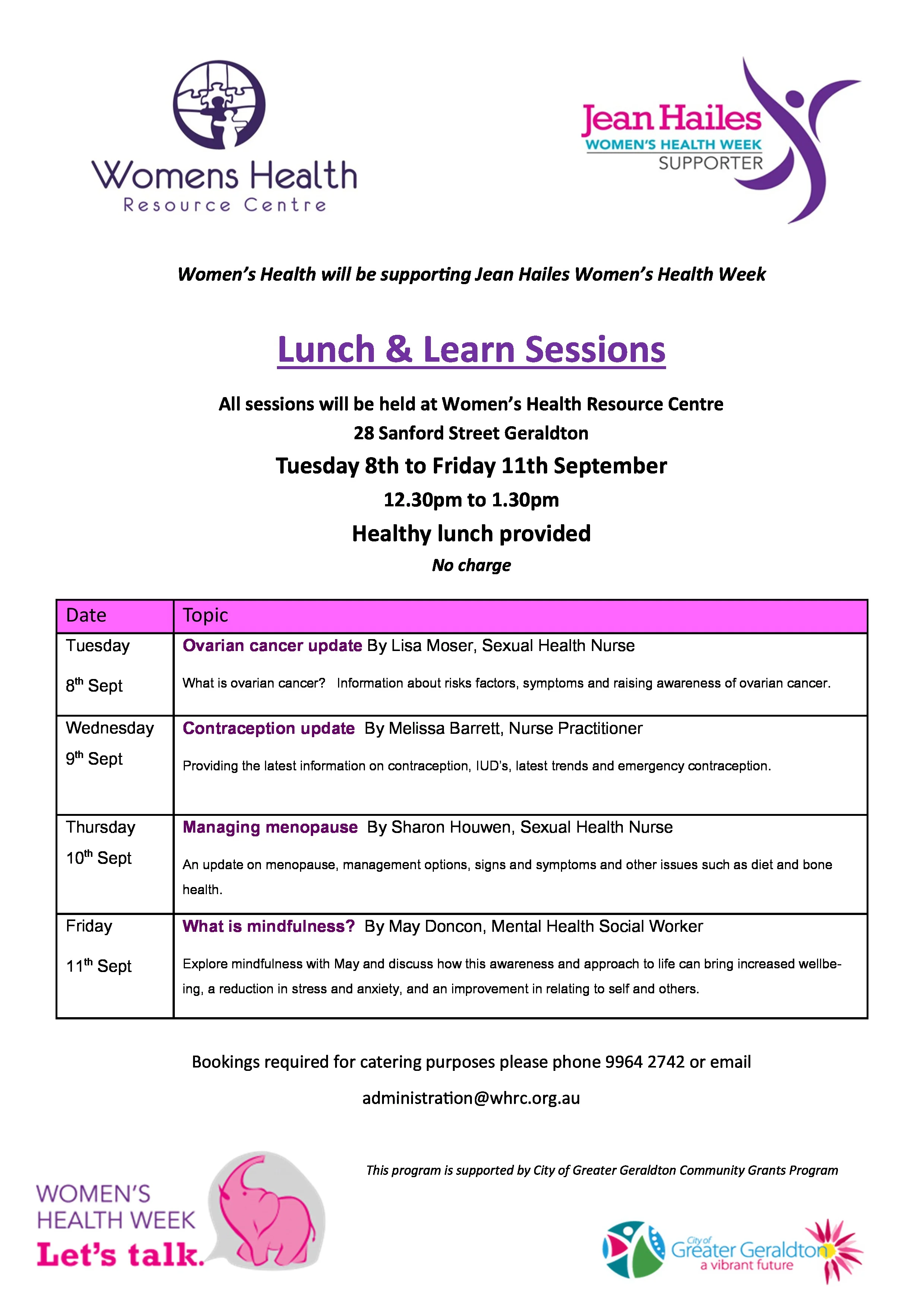 Women's Health Resource Centre will be offering 'Lunch and Learn' sessions on a range of topics. See flyer for details.