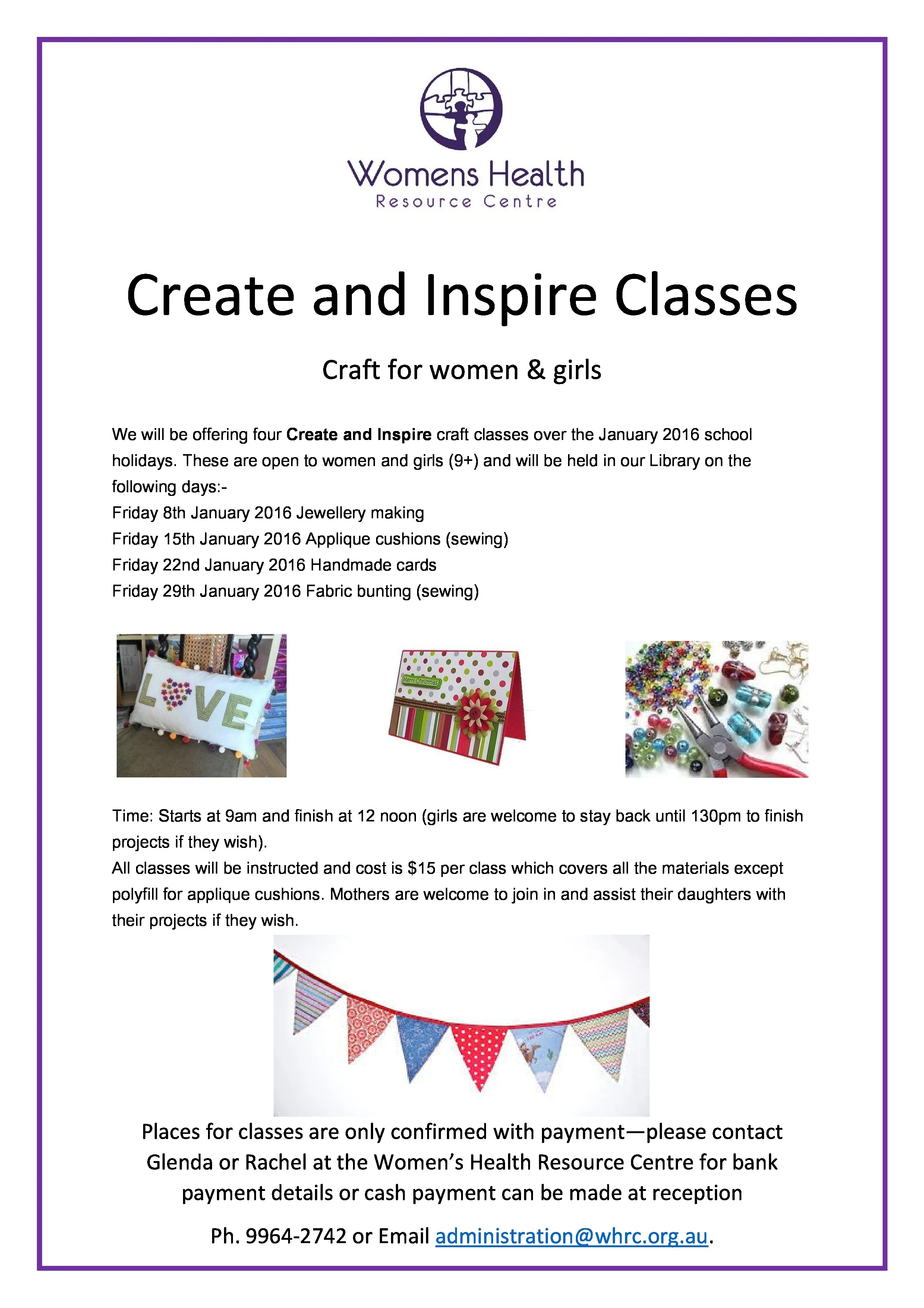 Women's Health Resource Centre are offering four Create and Inspire craft classes over the January 2016 school holidays, they are open to women or girls aged 9+ Classes are form 9am to 12 and are $15 8th of January Jewellery making 15th January Applique cushions (sewing) 22nd January Handmade cards 29th of January Bunting (sewing)