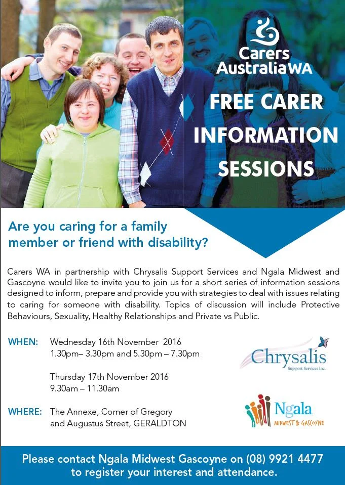 Carers WA in partnership with Ngala Midwest Gascoyne and Chrysalis Support Services would like to invite you to join us for a short series of information sessions designed to inform, prepare and provide you with strategies to deal with issues relating to caring for someone with disability. Topics of discussion will include Protective Behaviours, Sexuality, Healthy Relationships and Private vs Public behaviours.