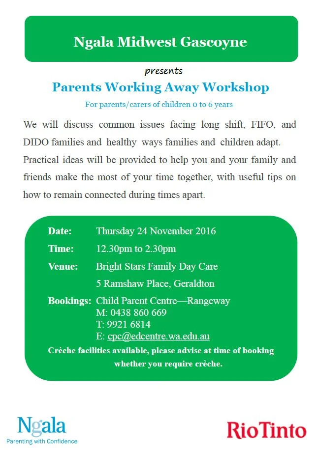 We will discuss common issues facing long shift, FIFO and DIDO families and healthy ways families and children adapt. Practical ideas will be provided to help you and your family and friends make the most of your time together, with useful tips on how to remain connected during times apart.