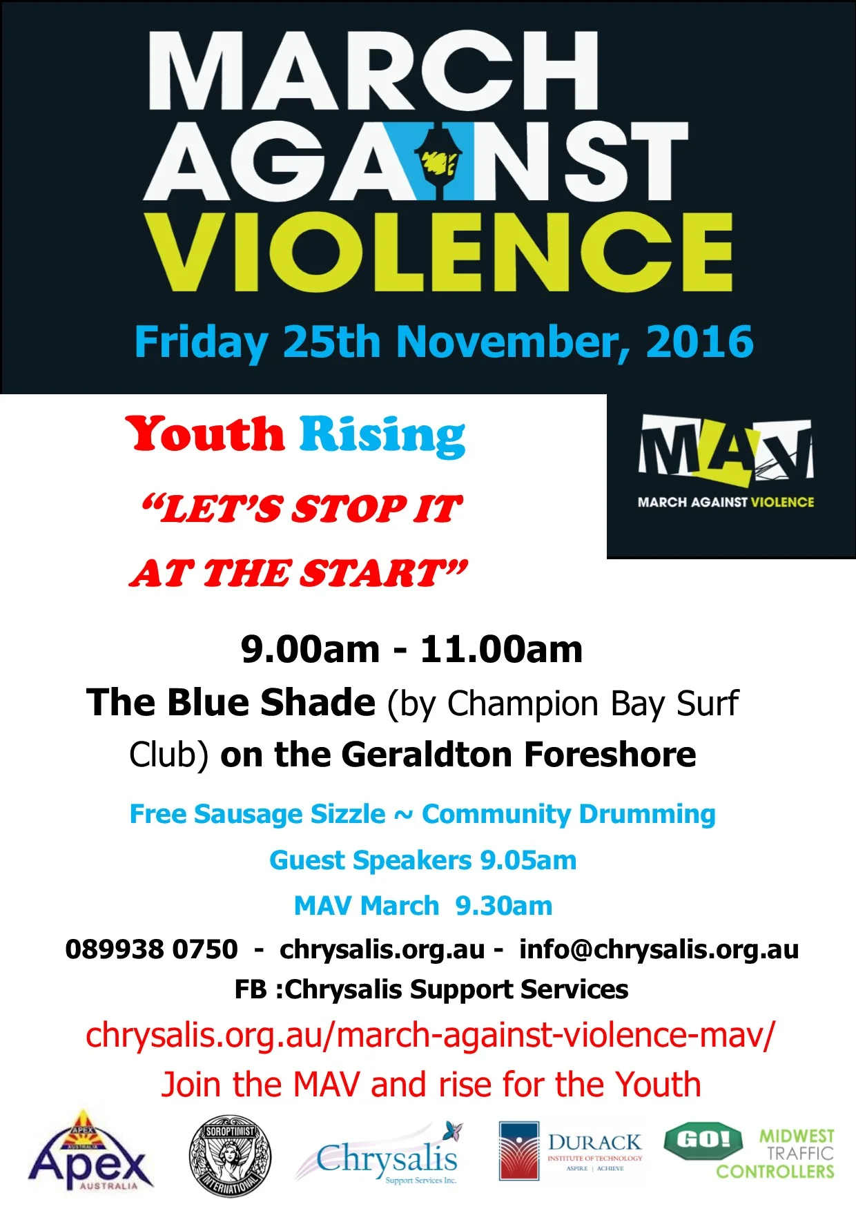 The March Against Violence (MAV) is a yearly event hosted by Chrysalis Support Services. The aim of the MAV is to raise awareness of domestic violence and sexual assault and to promote healthy relationships in our community by inviting inspiring and educational speakers and marching through the streets of Geraldton. The street march is a visual demonstration of the strong partnerships within the greater city of Geraldton who are working towards a violence free community where healthy relationships prosper.