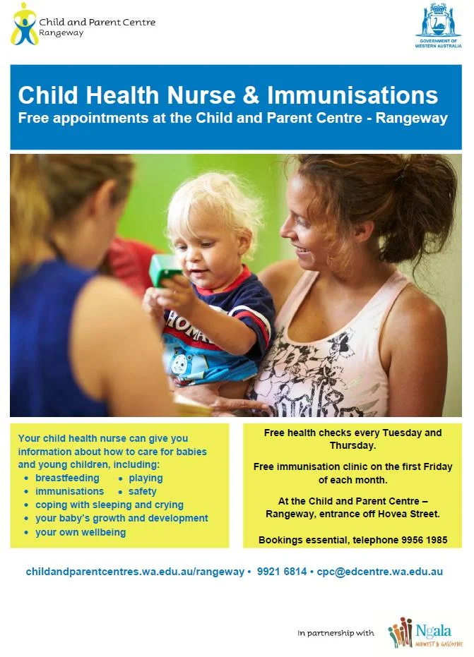 Free immunisation clinic with the Child Health Nurse team on the first Friday of each month, at the Child and Parent Centre - Rangeway. Bookings essential, telephone 9956 1985