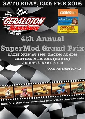 SuperMod Grand Prix. Gates open 3pm/racing 6pm. Canteen and bar (No BYO) Racing: Supermods, Sprintcars, Production sedans, junior sedans and quarter midgets. Adults $15. Kids 10-16 yrs $10. Bernie Clune Drive on Mullewa Road.