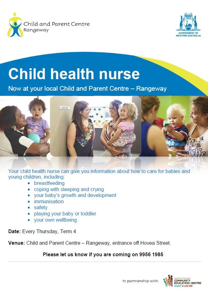 The Child Health Nurse is available for appointments all week, but is based at the Child and Parent Centre - Rangeway on Thursdays. To make your appointment call 9956 1985, and let them know if you'd like a Thursday at the Child and Parent Centre.