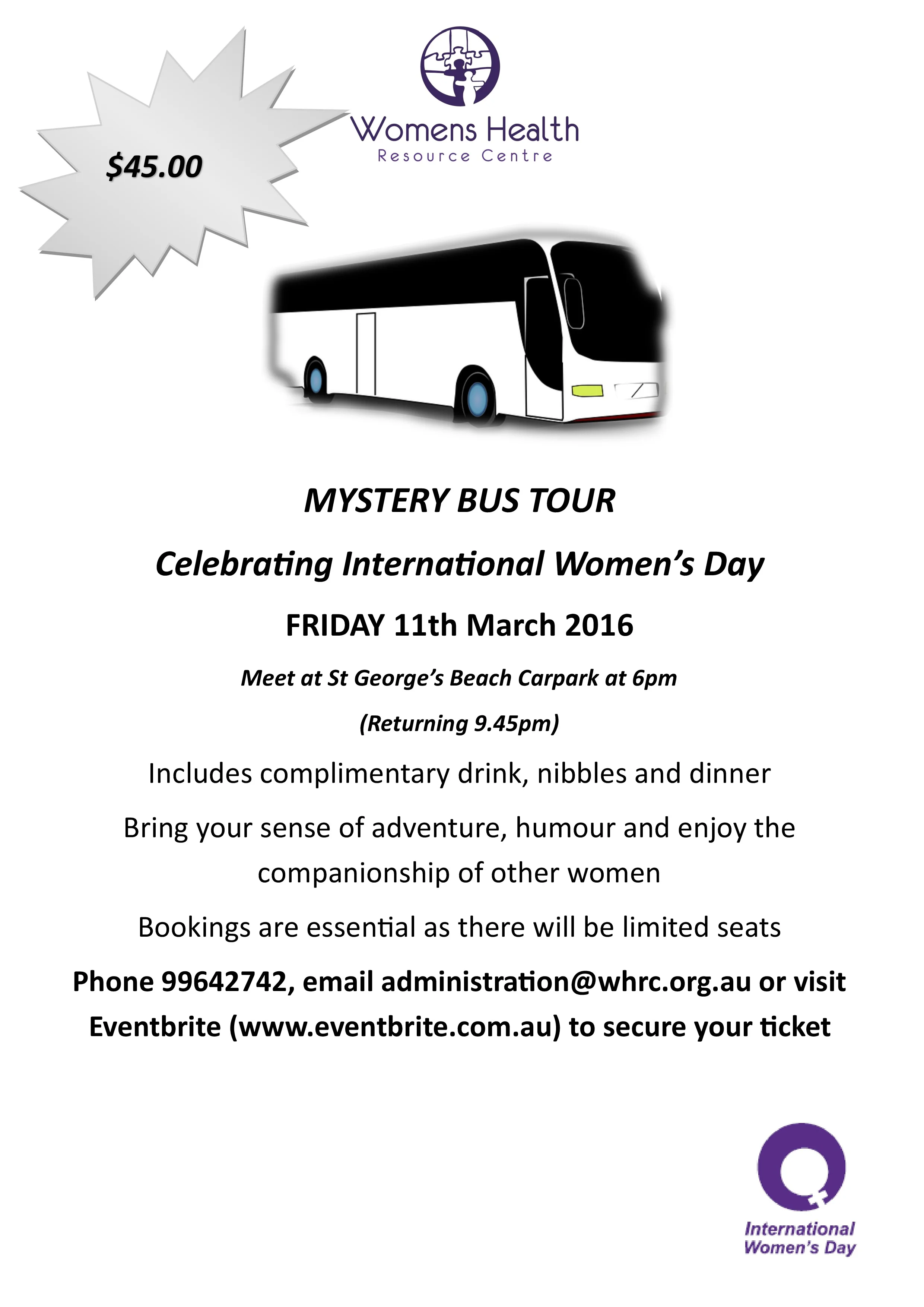 Help Women's Health Resource Centre celebrate International Women's Day with a Mystery Bus Tour. Dinner included.