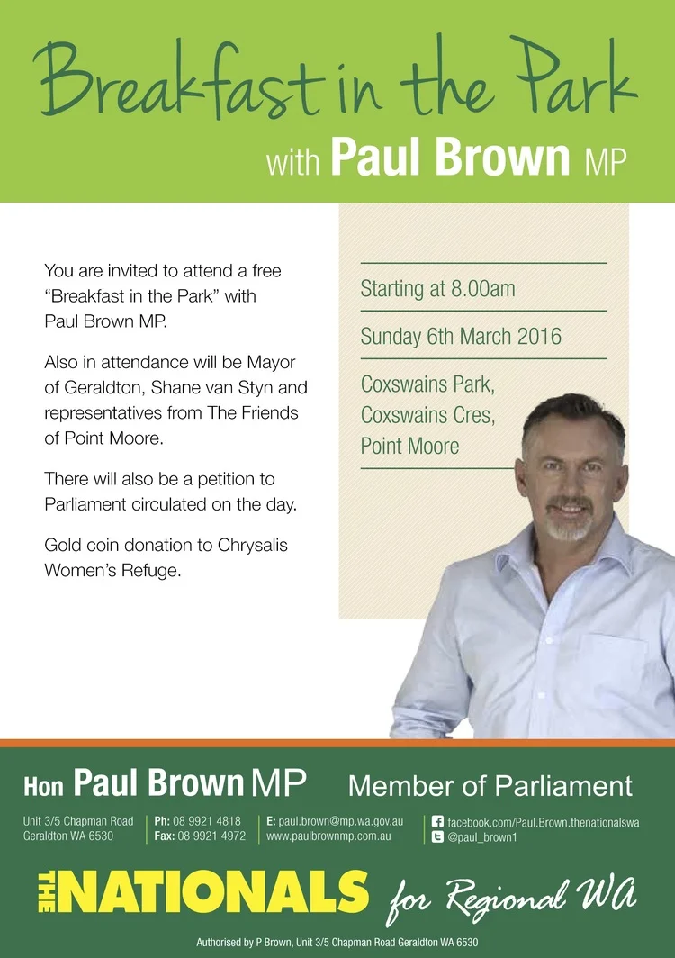 "You are invited to attend a free ‘Breakfast in the Park’ with Paul Brown MP and City of Greater Geraldton Mayor, Shane Van Styn, at 8am on Sunday 6 March at Coxswains Park, Point Moore, along with representatives from the Friends of Point Moore Incorporated.
