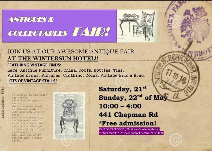 The Antique and Collectors Fair is at the Kuta Room, Wintersun Hotel Bluff point on May 21 and 22 from 10.00 to 4.00,