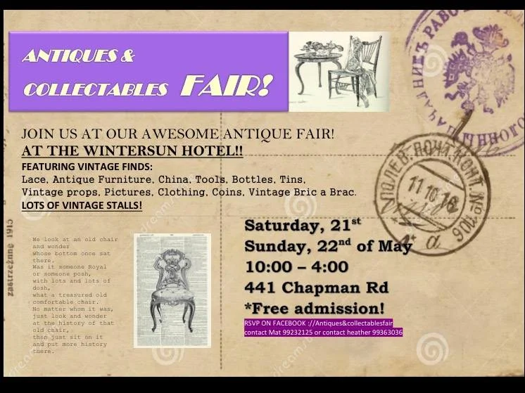 The Antique and Collectors Fair is at the Kuta Room, Wintersun Hotel Bluff point on May 21 and 22 from 10.00 to 4.00,