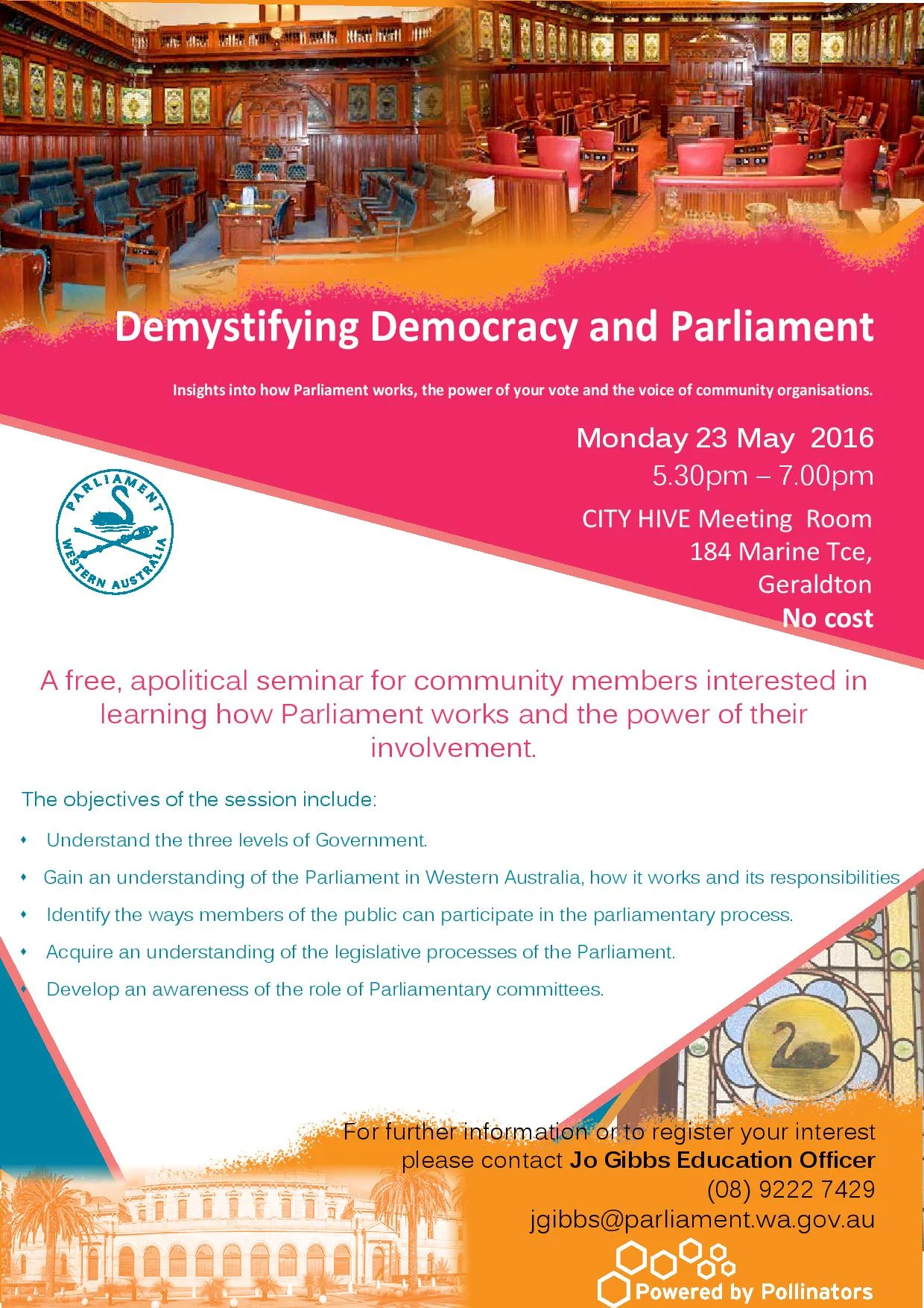 A free, apolitical seminar for community members interested in learning how Parliament works and the power of their involvement.