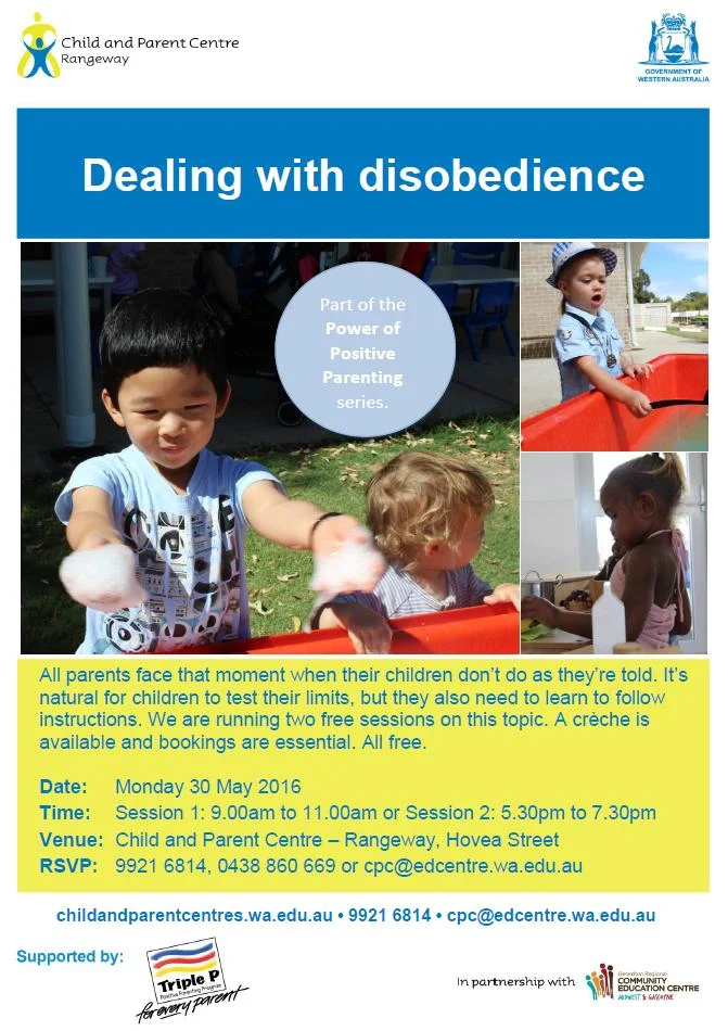 All parents face that moment when their children don't do as they're told. It's natural for children to test their limits, but they also need to learn to follow instructions. We are running two free workshops on this topic. A creche is available and bookings are essential. All free.