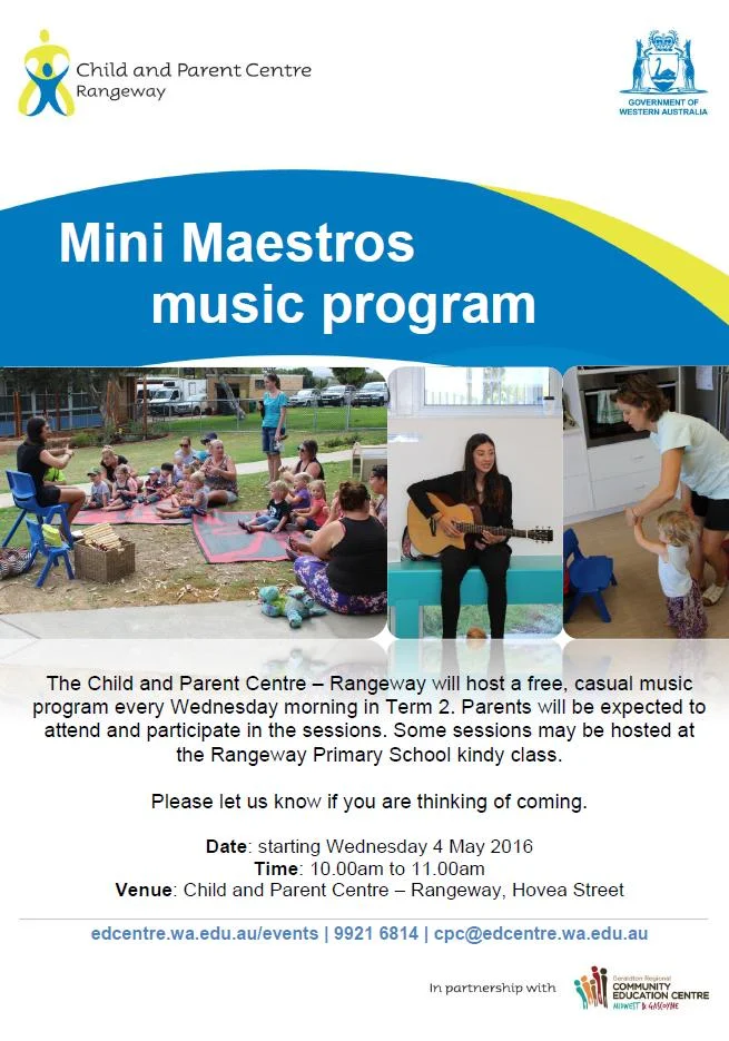 Starting week 2, Term 2 - every Wednesday morning at the Child and Parent Centre - Rangeway: Mini Maestros music program!
