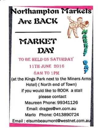 Northampton Msrkets are back this Saturday 11 June. In Kings park opposite IGA on the highway.