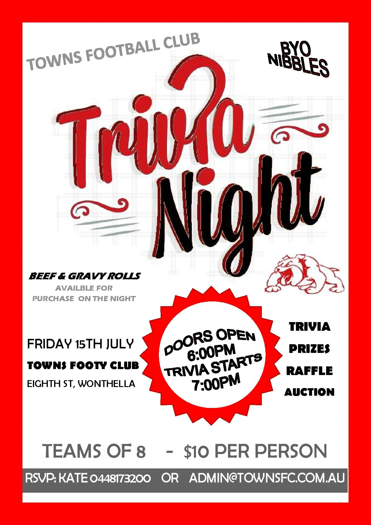 Towns Football Club are having their annual Trivia night. Get your team of EIGHT together and come down for a night of great trivia, awesome prizes and auction items.