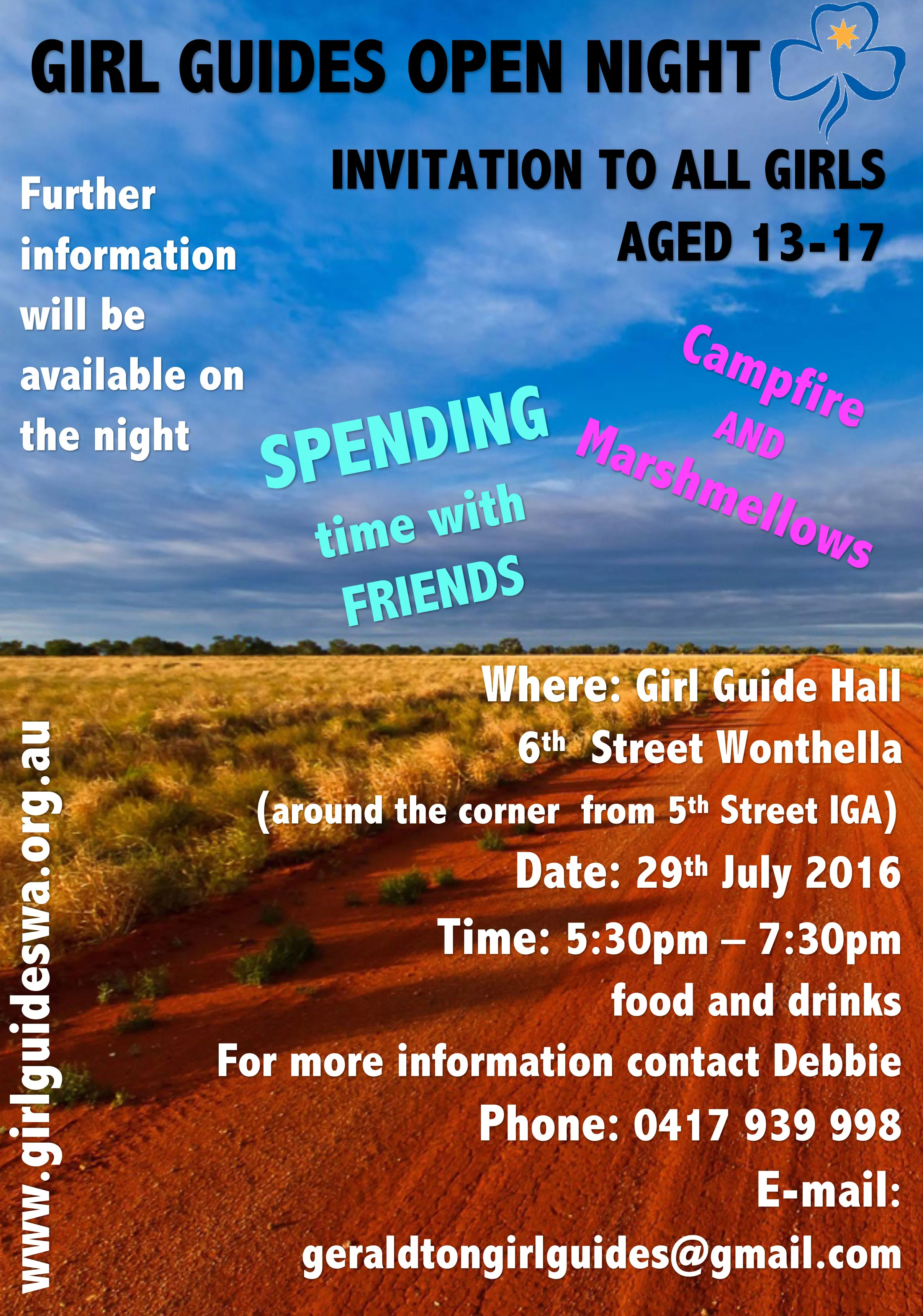 We have a open invitation to all girls aged 13 - 17 to come and experience and find out what Girl Guides is all about. We will be having displays, games, camp fire, and supper (pizza and drinks).