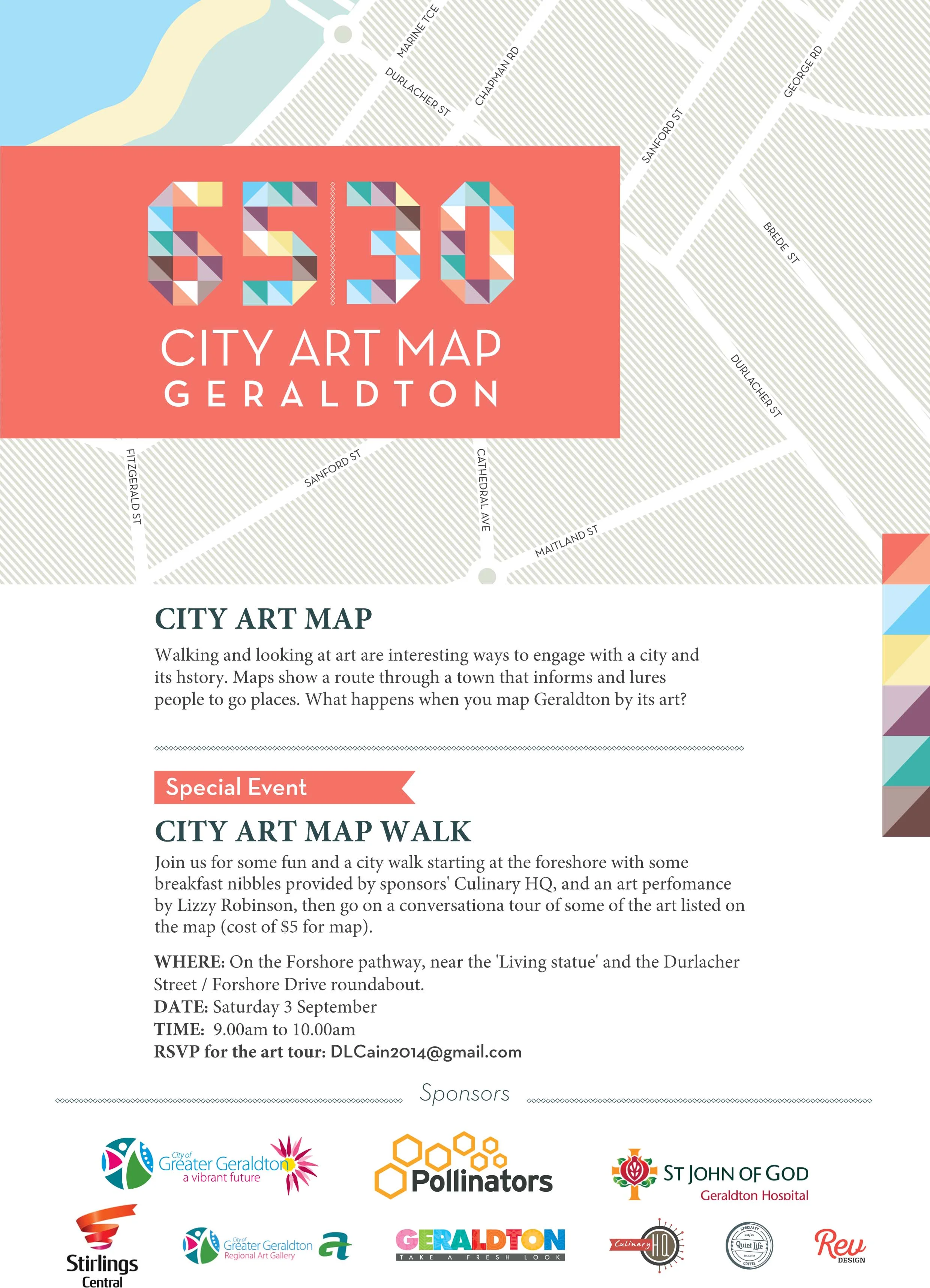 City art walk tour and a special event will be presented in the central area starting on the foreshore to provide an opportunity for a conversation about art with breakfast nibbles (provided by sponsors’ Culinary HQ), an art performance (by Lizzy Robinson), and a short tour of some of the art listed on the map, (cost of $5 includes map). This is a community art project supported by Pollinators and CGG Community Grant Funding