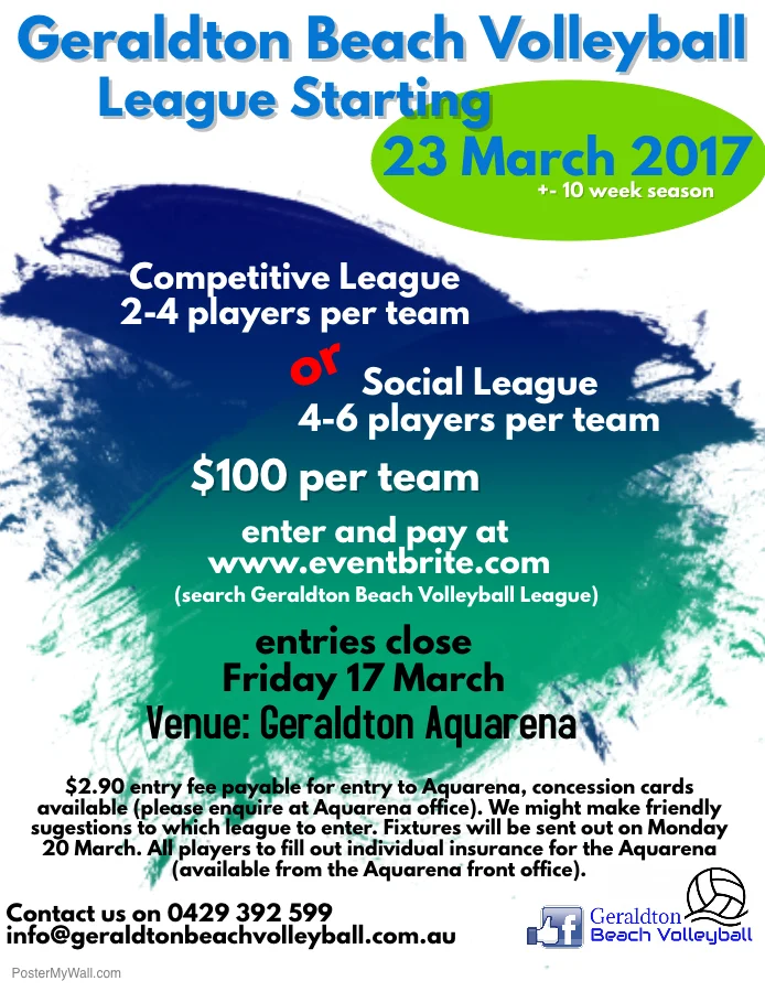 Geraldton Beach Volleyball League at the Geraldton Aquarena - Starts Thursday 23 March for approx. 10 weeks (depending on the number of teams that enter)