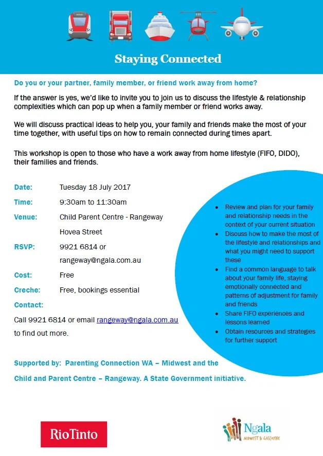 This workshop is open to those who have a work away from home lifestyle (FIFO, DIDO), their families and friends.