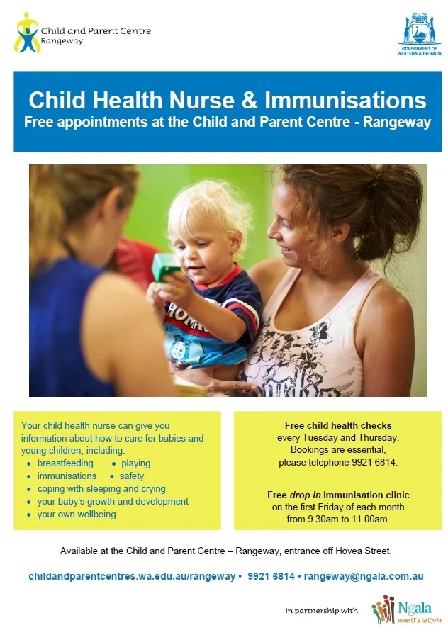 The Child Health Nurse is at Child and Parent Centra - Rangeway, every Tuesday and Thursday.