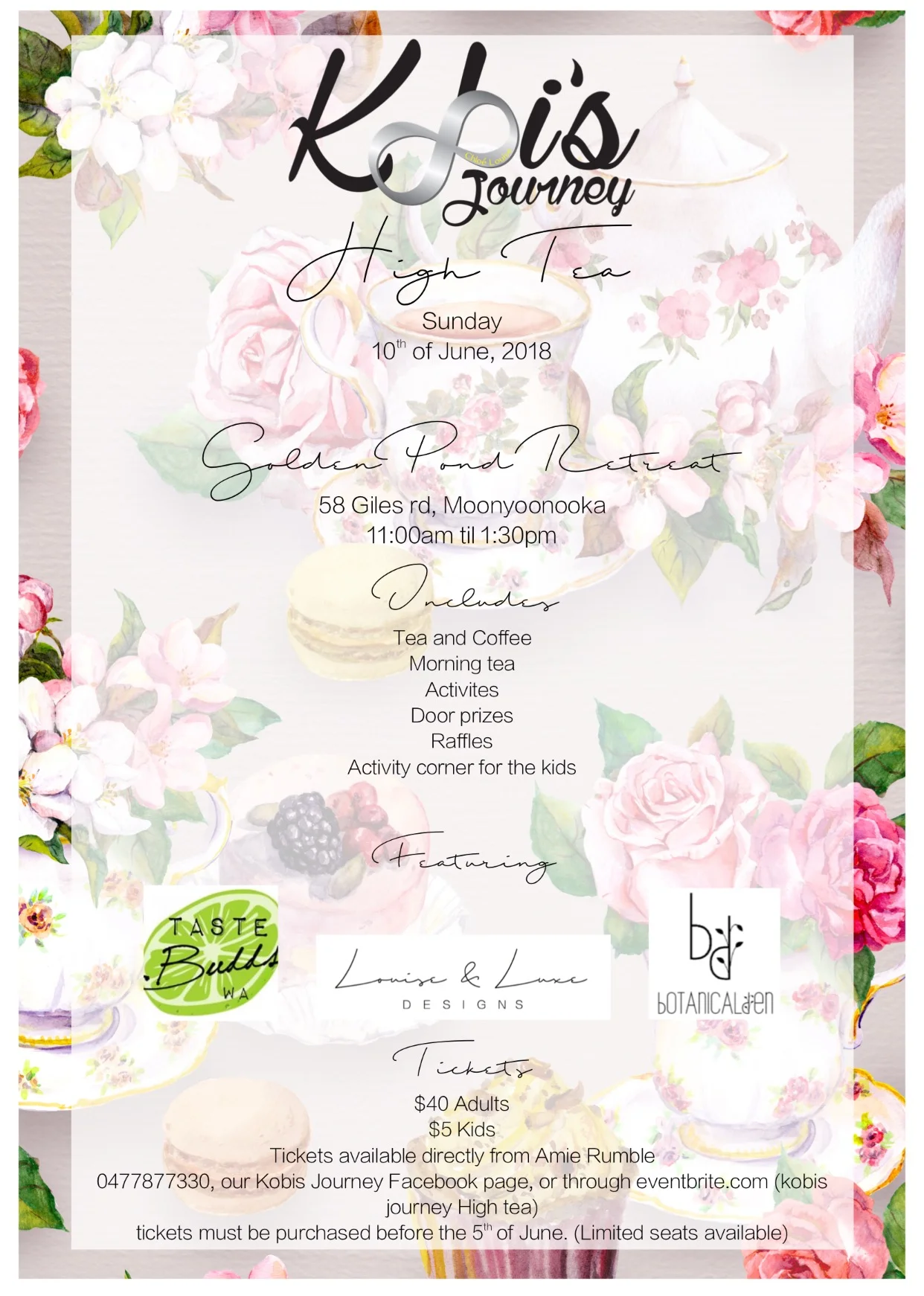 Come along and enjoy a morning out while fundraising for Kobis Journey, with beautiful food by Taste Budds WA, tea and coffee supplied, door prizes, raffles and activities throughout the day.