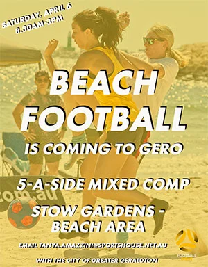 Beach Football is coming to Gero! This is a five-a-side mixed competition that will take place on the beach near Stow Gardens from 8.30am-3pm on Saturday 6 April.