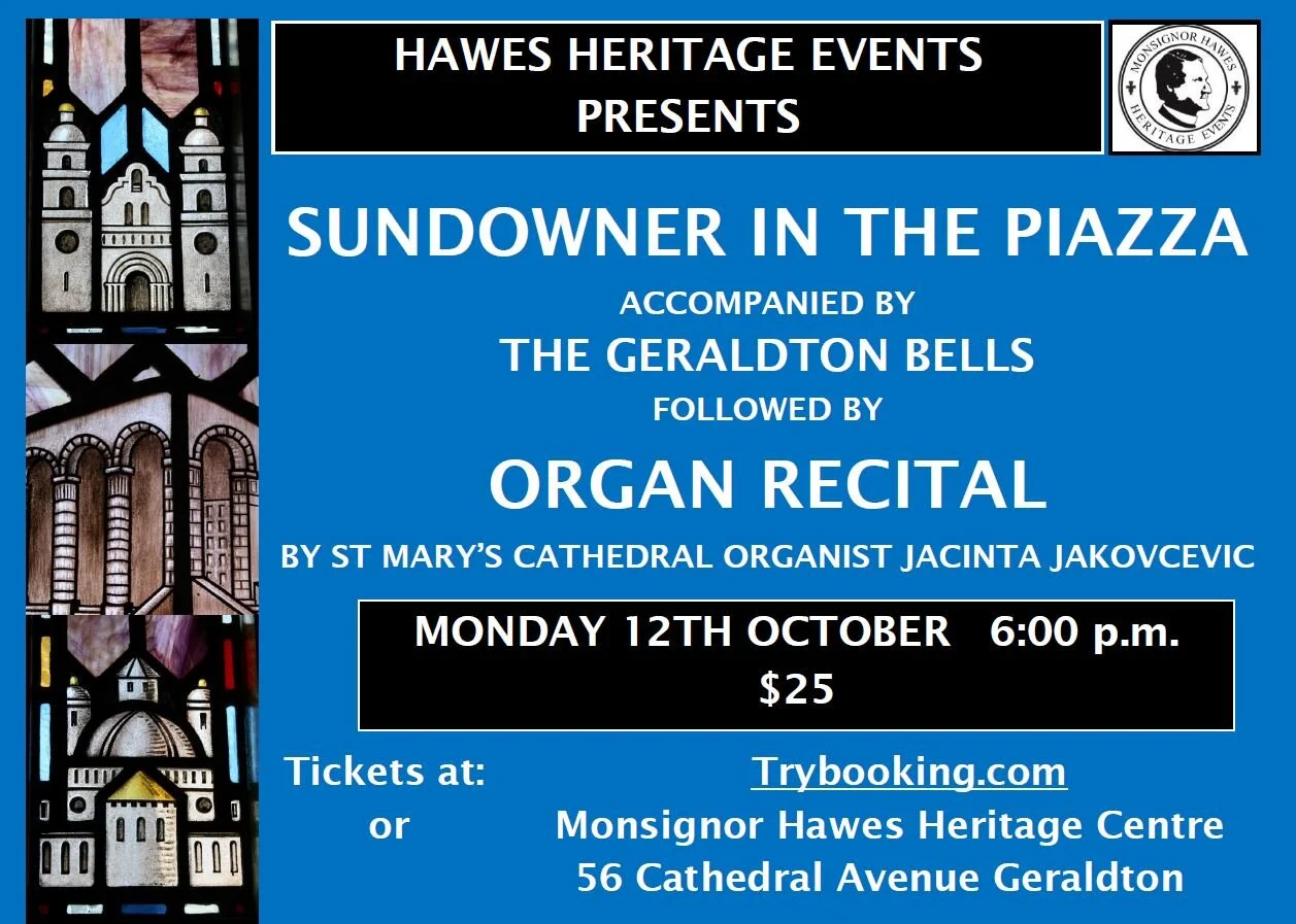 Enjoy a Sundowner in the Piazza accompanied by the Geraldton Bells, prior to an Organ Recital in St Francis Xavier Cathedral by St Mary's Cathedral organist Jacinta Jakovcevic.