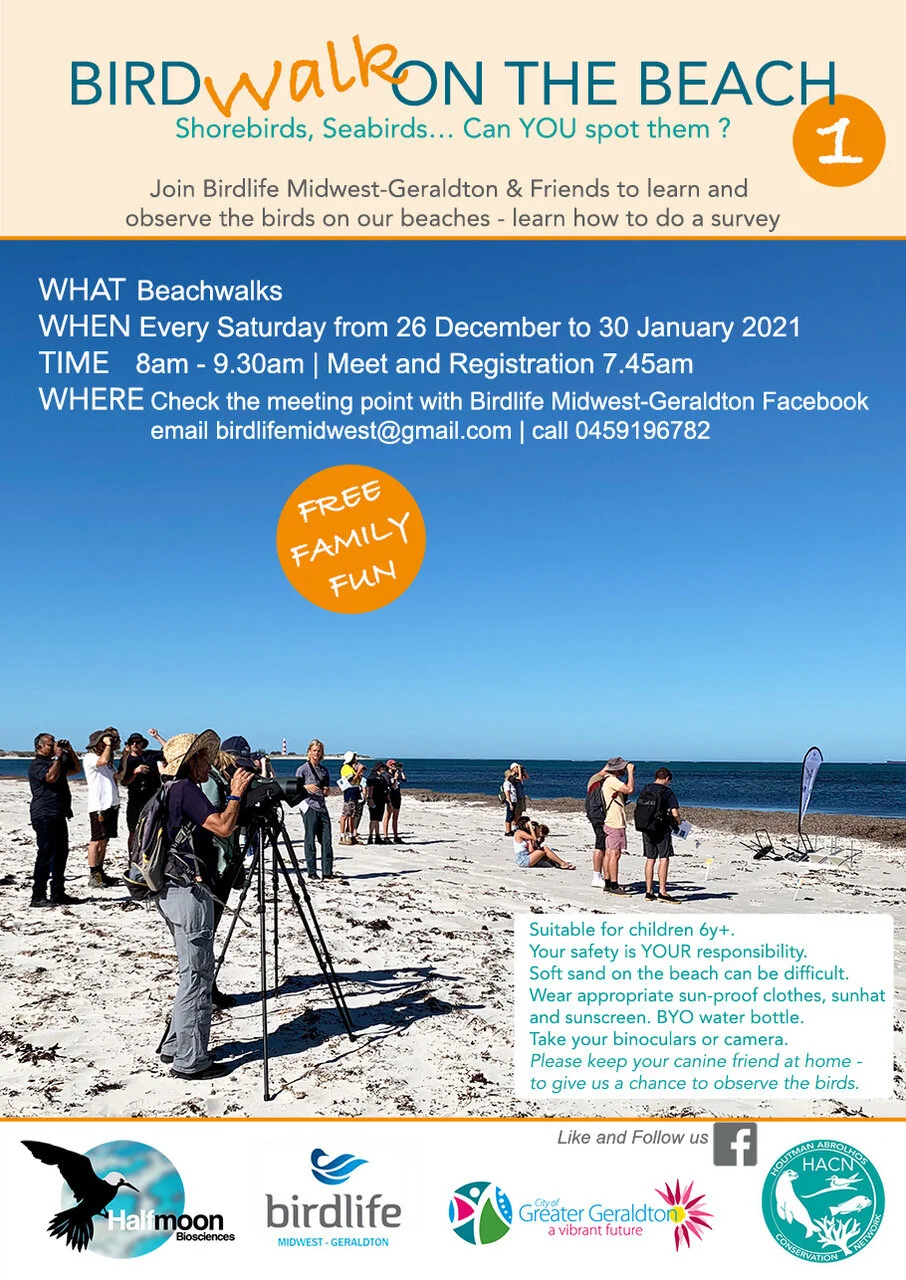 Join Birdlife Midwest-Geraldton & Friends to learn and observe the birds on our beaches - learn how to do a survey.