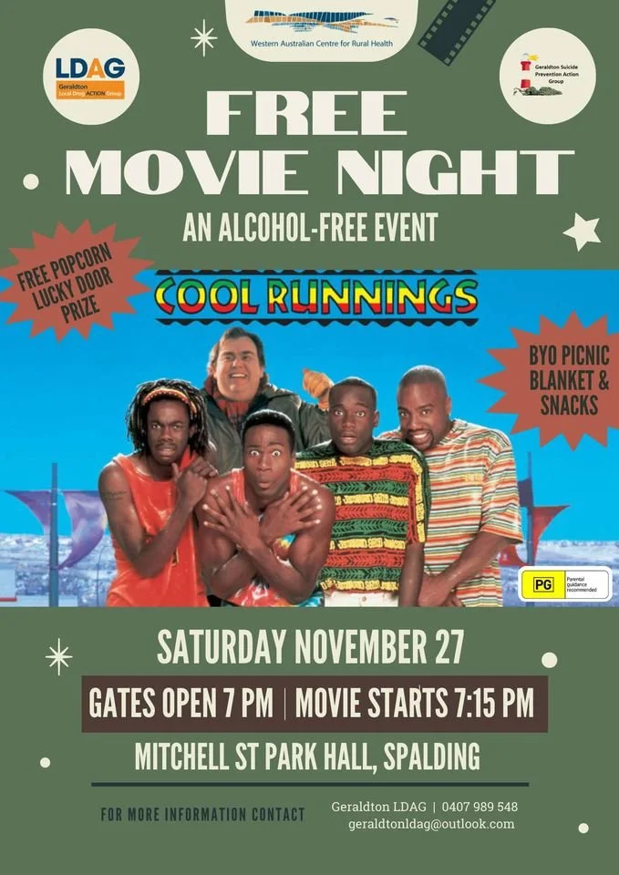 Come down to the Mitchell Street Park in Spalding to watch a free outdoor screening of Cool Runnings, starting 7pm. Grab your family, friends, a picnic rug and snacks. Free popcorn. An alcohol-free family friendly event. Brought to you by Geraldton Local Drug Action Group, Geraldton Suicide Prevention Action Group and the WA Centre for Rural Health.