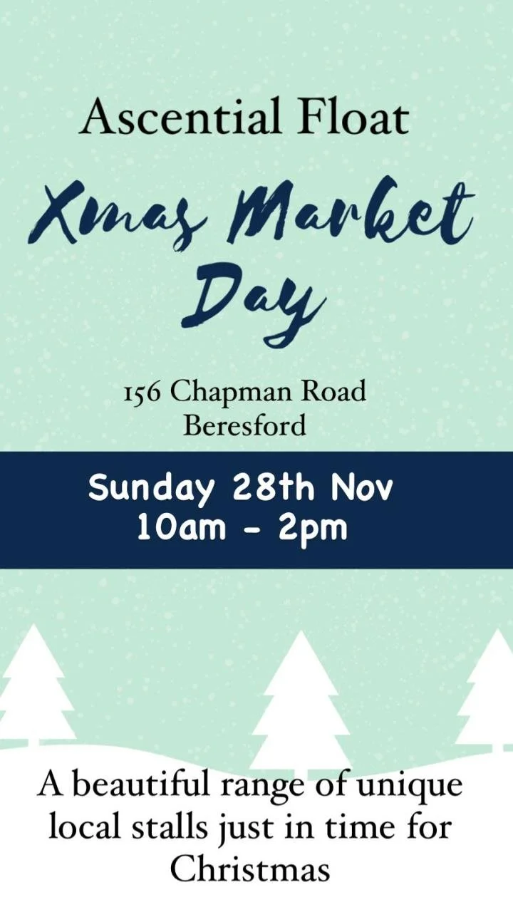 Xmas Market Day at Ascential Float ,Sunday 28th Nov .10am- 2pm . There will be a variety of beautiful unique local stalls including Sweet Olive coffee van. Ascential Float will also have their $50 Xmas special float gift cards available for purchase on the day. for further enquiries please contact https://www.ascential.com.au/