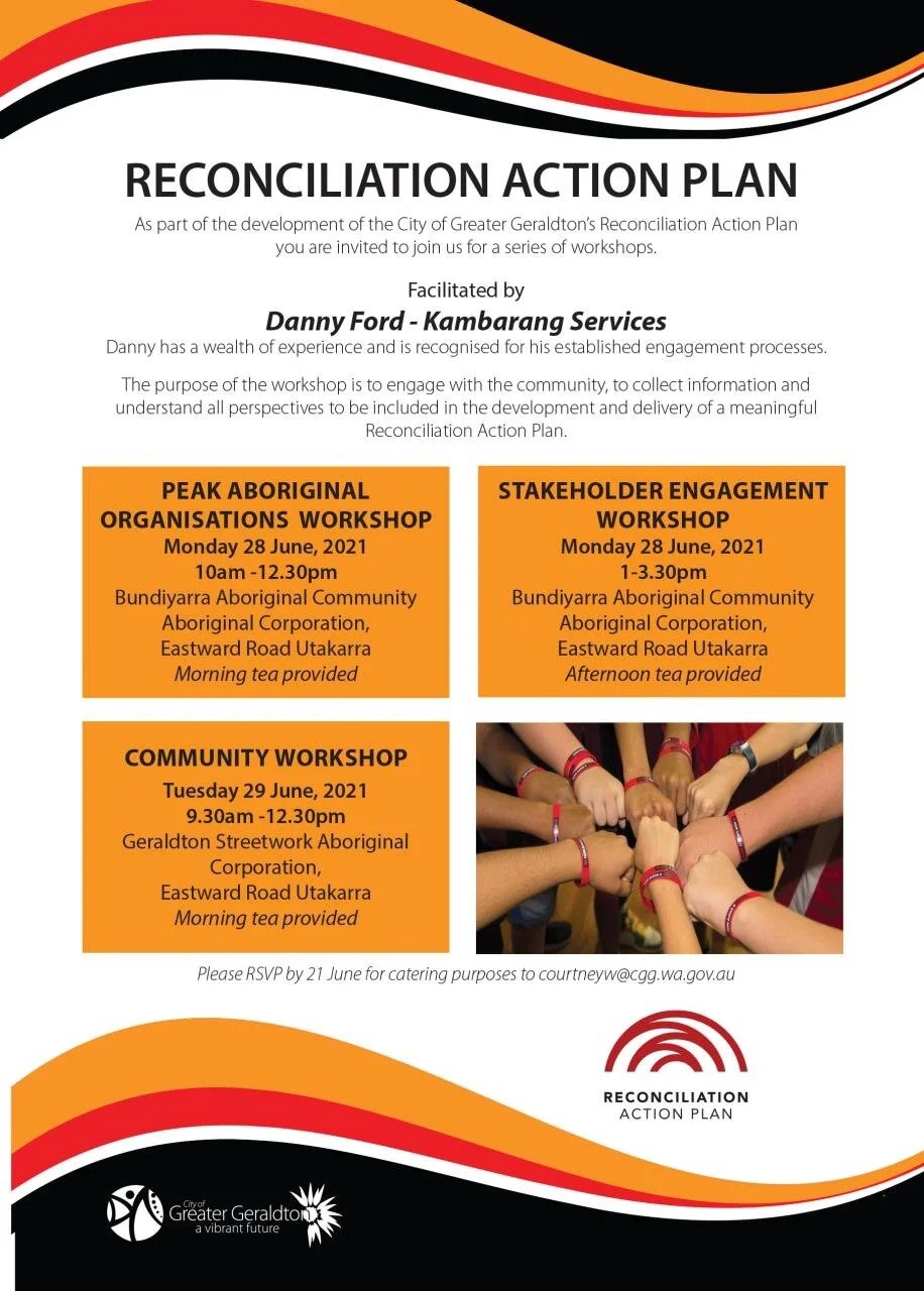 We're developing our Reconciliation Action Plan so we're inviting stakeholders and community members to a series of workshops facilitated by Danny Ford from Kambarang Services. Choose which session is right for you and then RSVP your attendance by contacting courtneyw@cgg.wa.gov.au