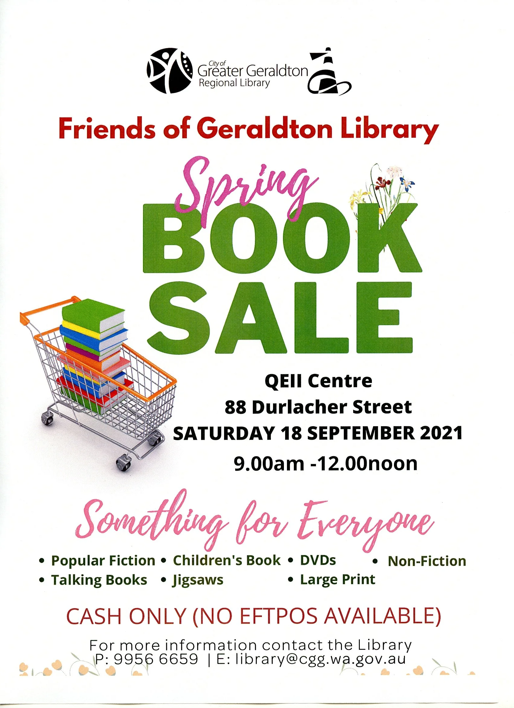 We are holding a huge book sale Saturday morning 18th September , 2021 at the Upper Hall, QE2 Centre, 88 Durlacher Street between 9.00 am and 12.00 noon.