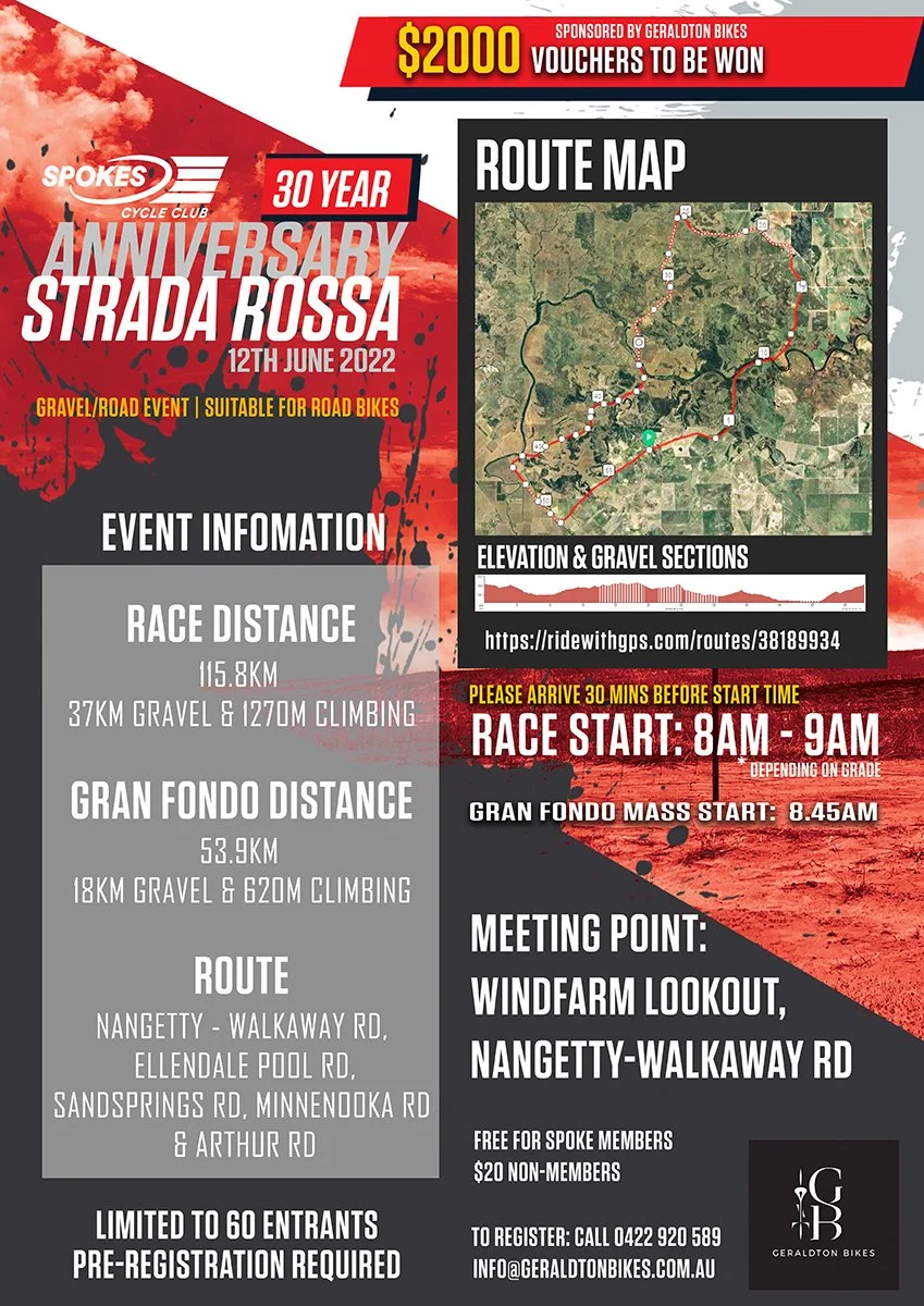 Pre-registration is essential so be sure to contact Geraldton Bikes on 0422 920 589 to secure your place in this 115.8km race. GOOD LUCK!