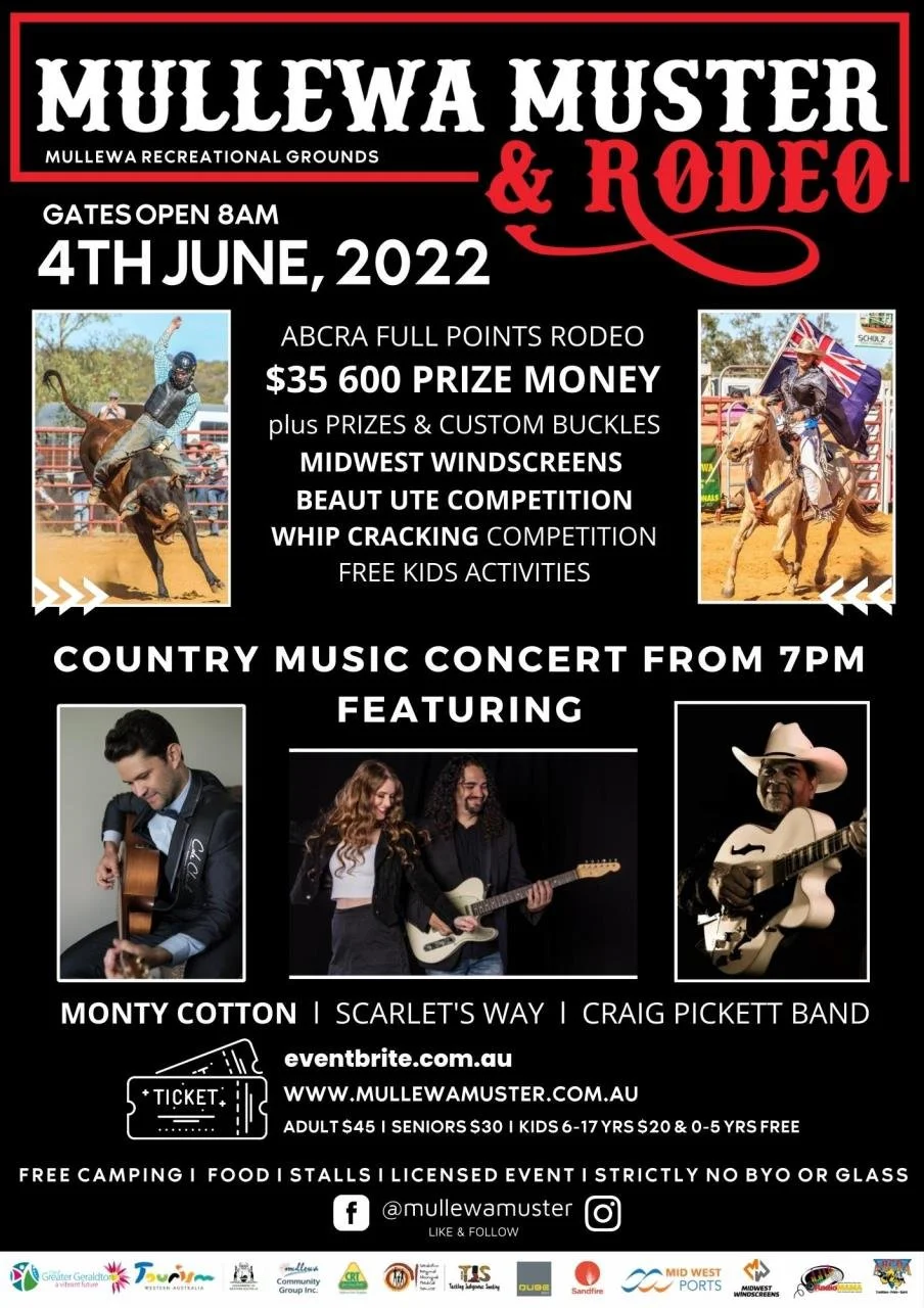 The Mullewa Muster & Rodeo is an all ages licensed event attracting over 3,000 visitors. The event consists of a Full Points & Prize Money Rodeo, a Beaut Ute Competition, a Whip Crackin’ Competition and a Country Music Concert.